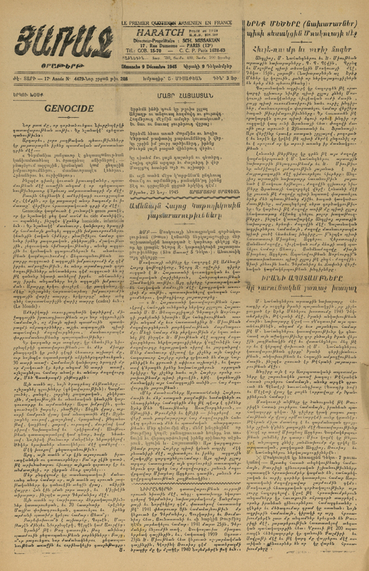 ÉDITORIAL Génocide par Chavarche Missakian in Haratch, numéro 4479, dimanche 9 décembre 1945. Traduction en français dans le livre de Chavarche Missakian, Face à l'innomable, p.117